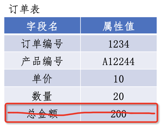 Demo:订单表中的“总金额字段” = “单价” * “数量”,不符合第三范式,去掉“总金额”字段才符合。