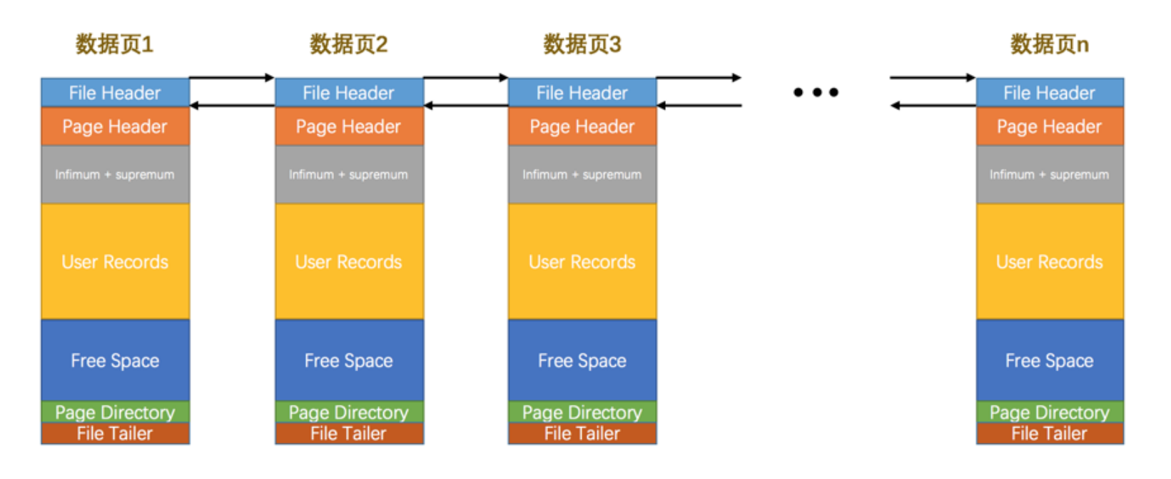 FIL_PAGE_PREV 和 FIL_PAGE_NEXT就分别代表本页的上一个和下一个页的页号。这样通过建立一个双向链表把许许多多的页就都串联起来了,而无需这些页在物理上真正连着。需要注意的是,并不是所有类型的页都有上一个和下一个页的属性,不过数据页 是有这两个属性的,所以所有的数据页其实是一个双链表,就像这样: