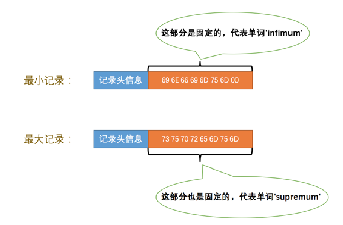 由于这两条记录不是我们自己定义的记录,所以它们并不存放在 页 的 User Records 部分,他们被单独放在一个称为 Infimum + Supremum 的部分,如图所示: